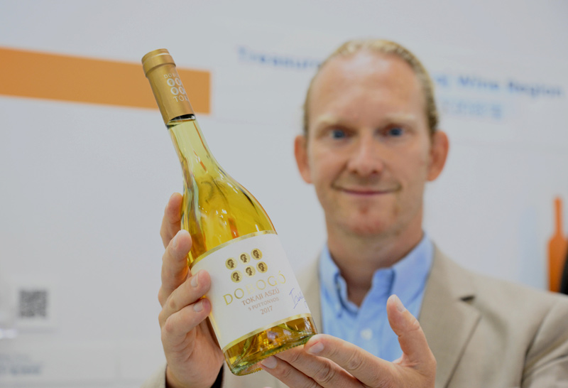 9月8日,來自匈牙利的酒商邵剝洋在展示匈牙利托卡伊葡萄酒產(chǎn)區(qū)出品的貴腐酒。