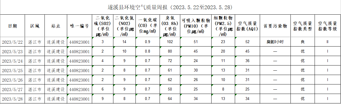 遂溪縣環(huán)境空氣質(zhì)量周報(bào)(2023.5.22至2023.5.28)