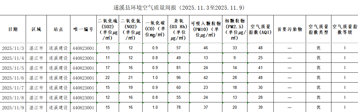 遂溪縣環境空氣質量周報(2025.11.3至2025.11.9)