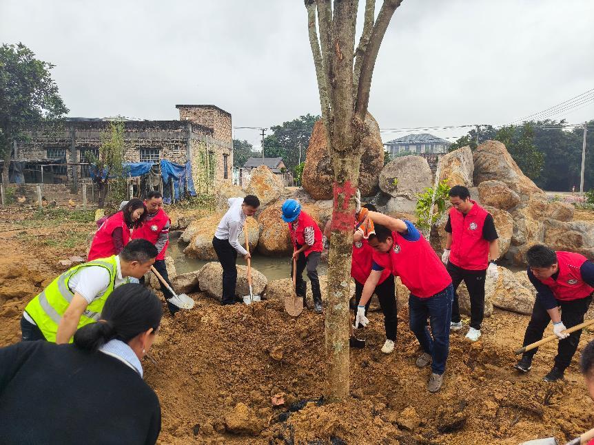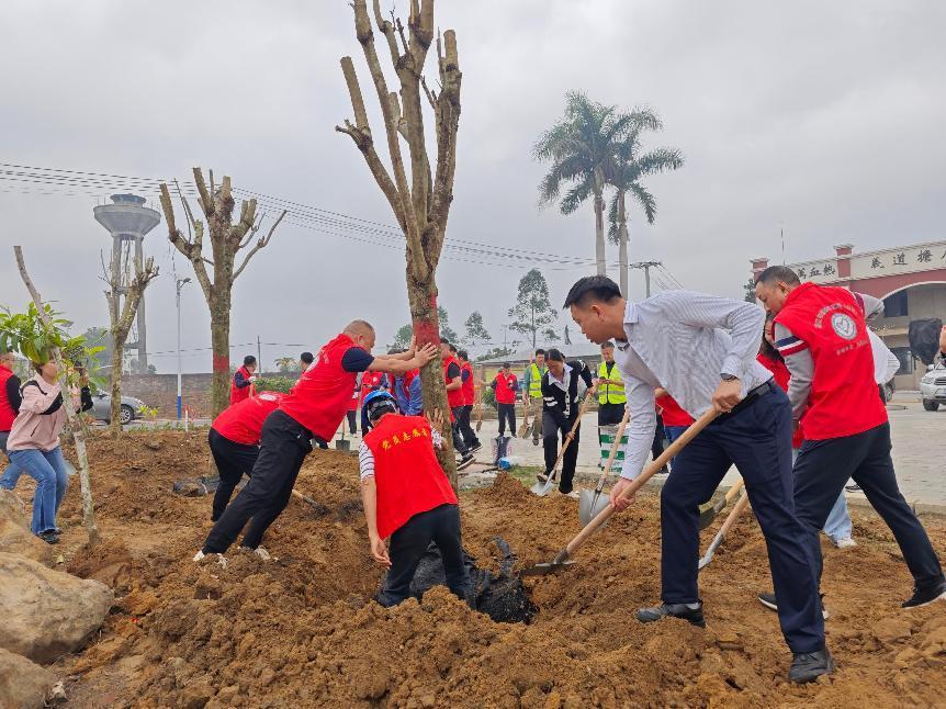 活動現場,市煙草專賣局紀檢組組長曾珊、洋青鎮黨委書記陳榮慶等領導充分發揮模范作用,帶頭種下4棵胸徑8厘米以上的鳳凰樹。隨即,市、縣駐鎮幫鎮扶村工作隊派出單位的黨員干部、竹山村黨員志愿者及群眾代表互相配合,三人成組、五人成團,按照技術規范,扶正樹苗、揮鍬填土、踩實樹坑、提水澆灌,每個環節都銜接有序,植樹現場呈現出一派緊張有序、熱火朝天的勞動場景。