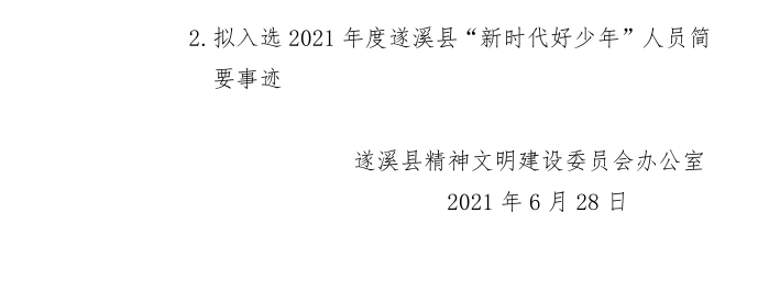 關(guān)于擬入選2021年度遂溪縣“新時(shí)代好少年”人員的公示 | | 作者: | 來源:遂溪縣精神文明建設(shè)委員會(huì)辦公室 | 時(shí)間:2021-06-28 10:37:14 點(diǎn)擊數(shù):- 關(guān)于擬入選2021年度遂溪縣“新時(shí)代好少年”人員的公示.pdf 【打印正文】